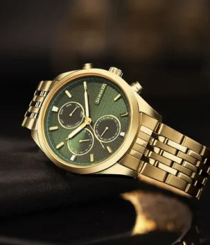 Sonata Magna Quartz Multifunction Green Dial Golden Stainless Steel Strap Watch For Men 7155ym01